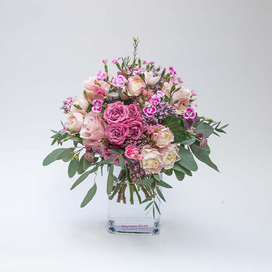 Der Strauss wird in zarten pastellfarben mit Grün gebunden. Er hat eine klassische runde Form und enthält gemischte Blumen in passenden Pastelltönen.