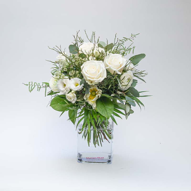 Ein in klassischem weiss gehaltener, runder Strauss, der immer passt. Mit gemischten Blumen und Grün gebunden.