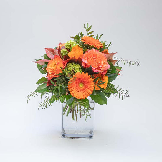Ein rund gebundener Strauss in wunderbaren Orangetönen. Der Strauss ist mit gemischten Blumen und kräftigem Grün gebunden.