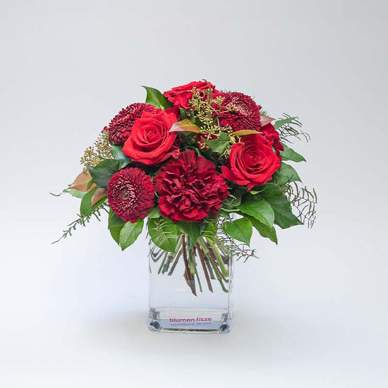 Ein schöner runder Strauss in stimmigen Rottönen mit gemischten Blumen und Bindegrün gebunden.