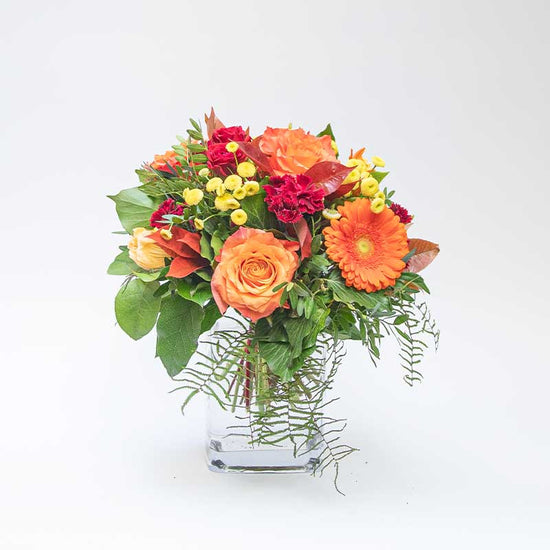 Dieser in den warmen Farben gehaltene Strauss verdankt seinen Namen dem Sonnenuntergang, an welchen die Farben erinnern. Der Strauss ist rund und mit passendem Grün gebunden.